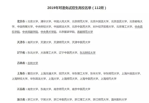 根据中华人民共和国教育部所公布的信息,2019年内地对港免试招生高校名单增至112所,名单如下: