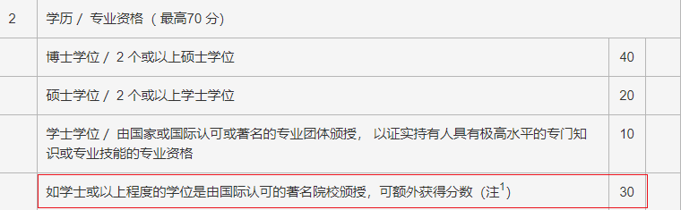 而优才计划分两种:成就计分制和综合计分制。在综合计分制中,申请者若是持有由国际认可的著名院校(前100强)颁授的学士学位或以上学位将获得30分的额外加分,而这一学历也是香港入境处青睐的一点。