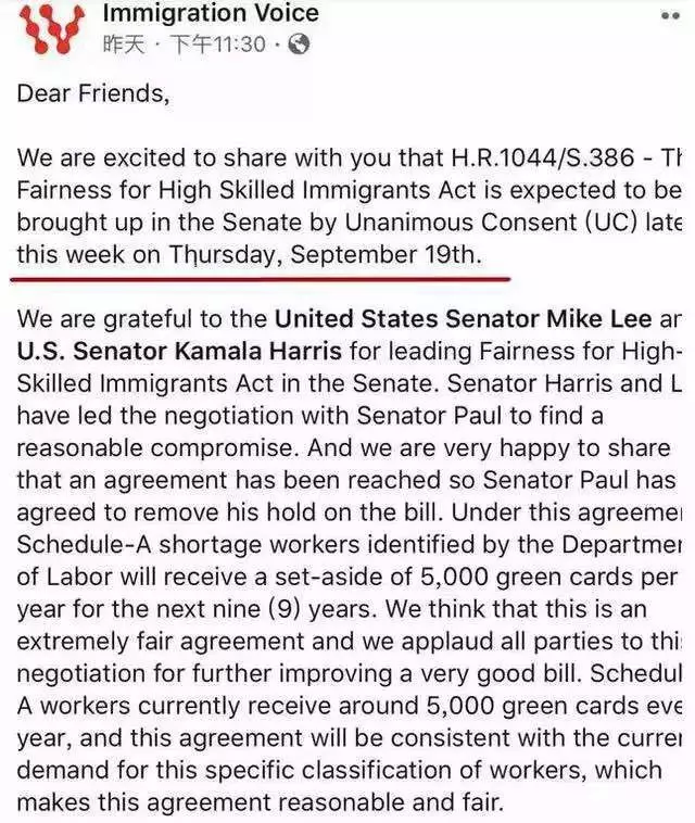 在当地时间9月18日,美国Immigration Voice组织曾在其官方脸书上发布一条推文,指出S.386提案将在9月19日强行闯关通过。