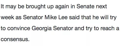 参议员Mike Lee表示将尽量与佐治亚州参议员David Purdue达成一致,并有信心在本周再次进行投票把这个提案变成法律。