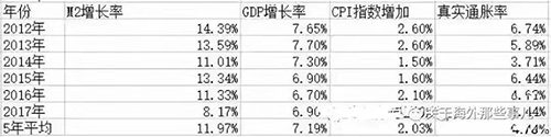 进一步的,如果考虑到2012年底新一届领导人上任以来,经济上不再强调货币刺激,而是希望通过市场的结构性改革来解决经济发展中出现的问题。中国的广义货币供应增长率大幅度放缓,所以如果采用近5年的数据,结果将会乐观很多(下表是2012年以来的M2、GDP、官方通胀、真实通胀的增长率)。
