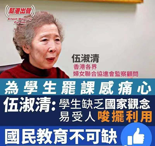 2000年,伍淑清成立了中华基金中学,传承中华文化教育。学校的多媒体室里播放着介绍中国崛起历程的影像资料,还摆放着许多中文书籍,内容涵盖了中国政策、历史、地区介绍和名人传记等。这些书,是她从内地背回来的,香港书店买不到。
