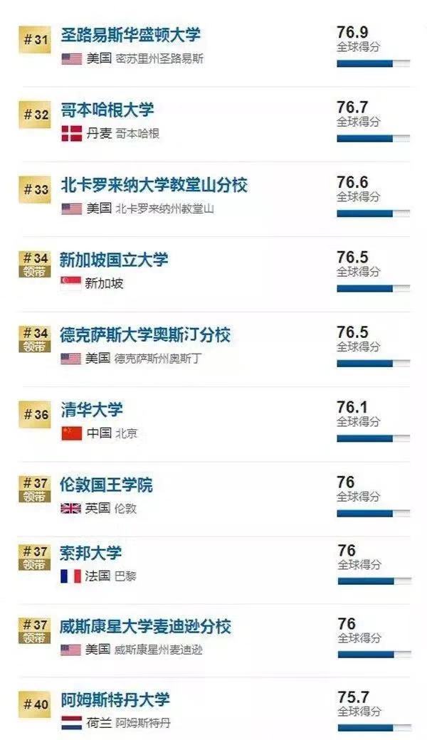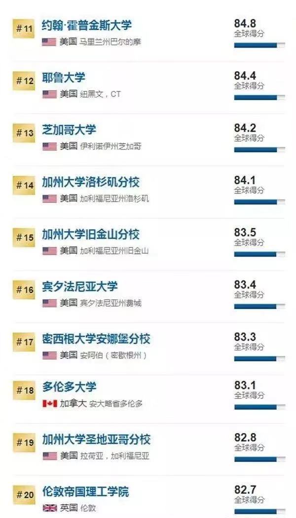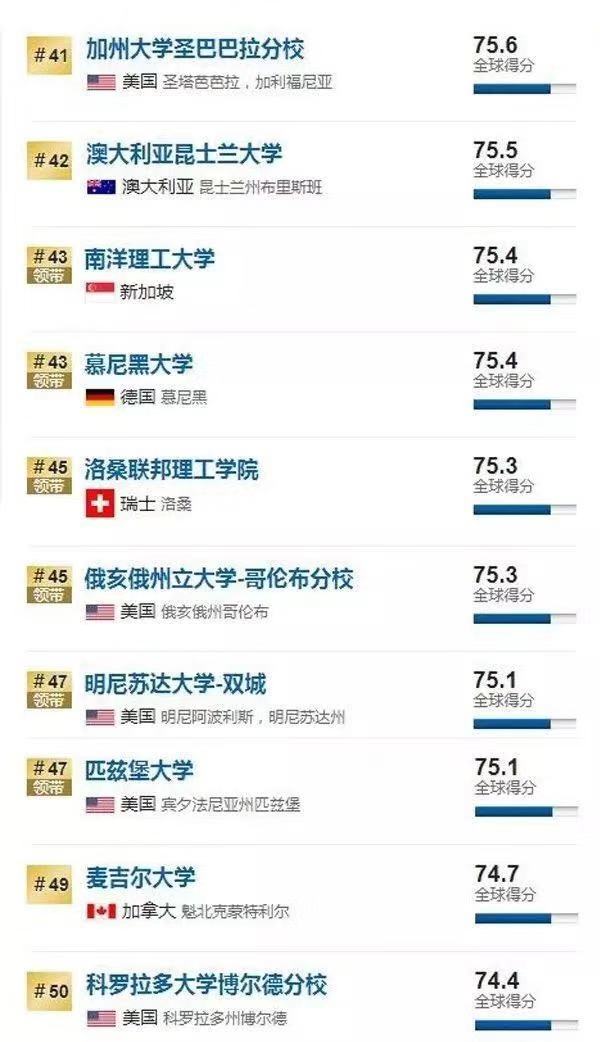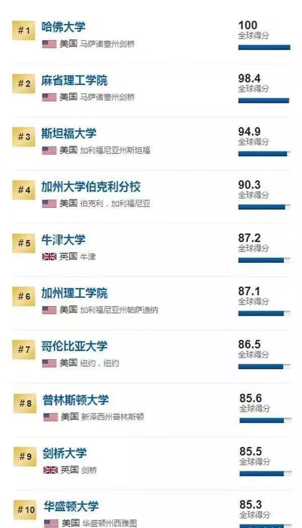 加州理工第六名,哥大第七名,普林斯顿第八名,剑桥大学排在第9,第10名为华盛顿大学。