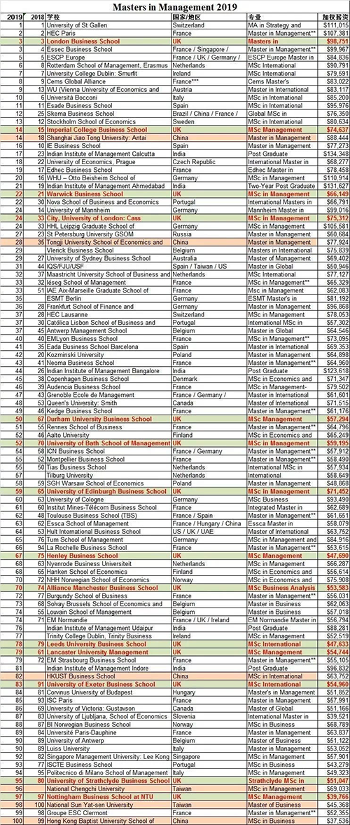 2019年的金融时报管理学硕士排名,共有119所大学参加。