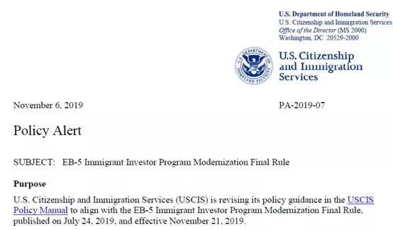 美国移民局官网发布了EB-5审案的政策更新指导,以确保该政策手册符合即将于11月21日正式生效的国土安全部EB-5改革新规。