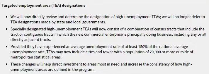 2.新规规定,TEA地区为农村地区或失业率高的地区,其失业率至少为全美国平均失业率的150%。