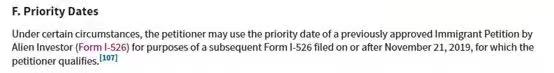 在审案手册中移民局添加了保留优先日期的规则,以解释“某些获得I-526申请批准的申请人,如果因某种原因(例如区域中心关停)而需要重新递交I-526申请,可以在新的申请上保留原有的优先日期。