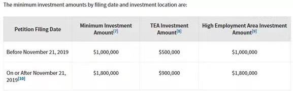 在审案手册针对投资的章节中,移民局对最低投资额进行了调整:对于在生效日期当日或之后提交的EB-5移民申请,最低投资额为180万美元,TEA地区则更新为90万美元。