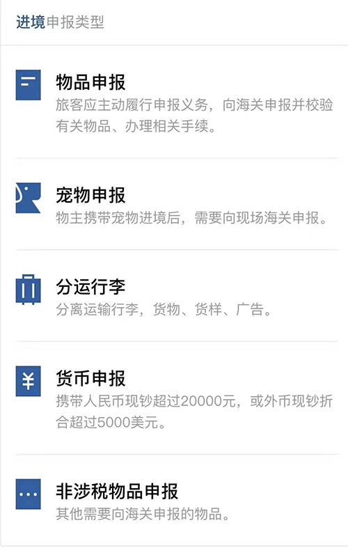 目前入境的申报类型支持:物品申报,宠物申报,分运行李,货币申报和非涉税物品申报这五项常用通关申报项目。