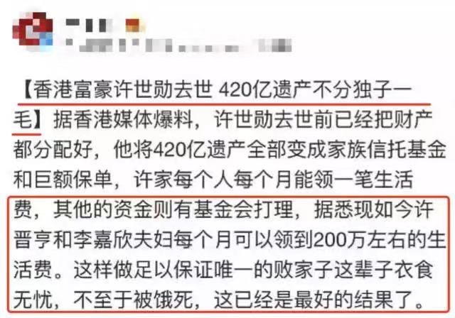 这400多亿的遗产,全部放到家族信托中,这样一来,许晋亨、李嘉欣就和家族里的其他人一样,每月领取分红。