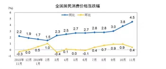 数据显示,2019年11月份,CPI同比上涨4.5%。其中,食品价格上涨19.1%,非食品价格上涨1.0%;