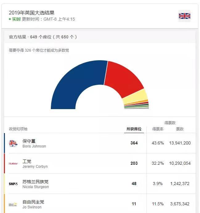 最终,首相鲍里斯·约翰逊领导的保守党赢得此次大选。鲍里斯也将继续担任首相。