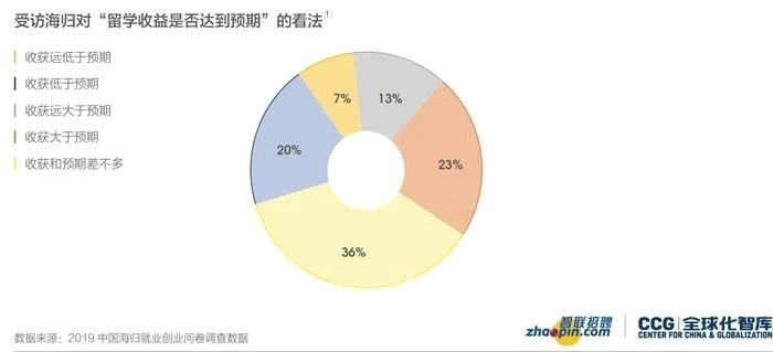 其中,选择“收获大于预期”和“收获远大于预期”的受访海归比例分别为23%和13%,选择“收获和预期差不多”的受访海归比例为36%。