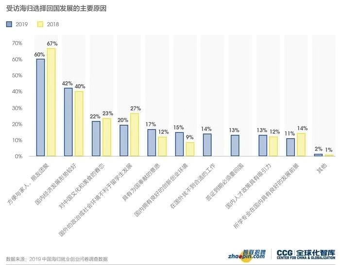 报告调查显示,2019年,“方便与家人、朋友团聚”仍是受访海归选择回国发展的首要原因,占受访人数的60%。