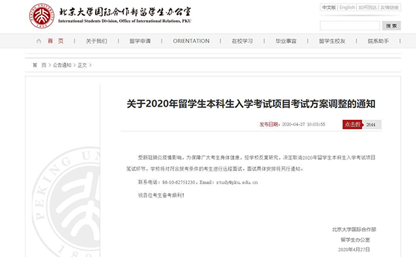 4月27日,北大国际合作部留学生办公室发布《关于2020年留学生本科生入学考试项目考试方案调整的通知》,通知明确:决定取消2020年留学生本科生入学考试项目笔试环节,学校将对符合报考条件的考生进行远程面试。