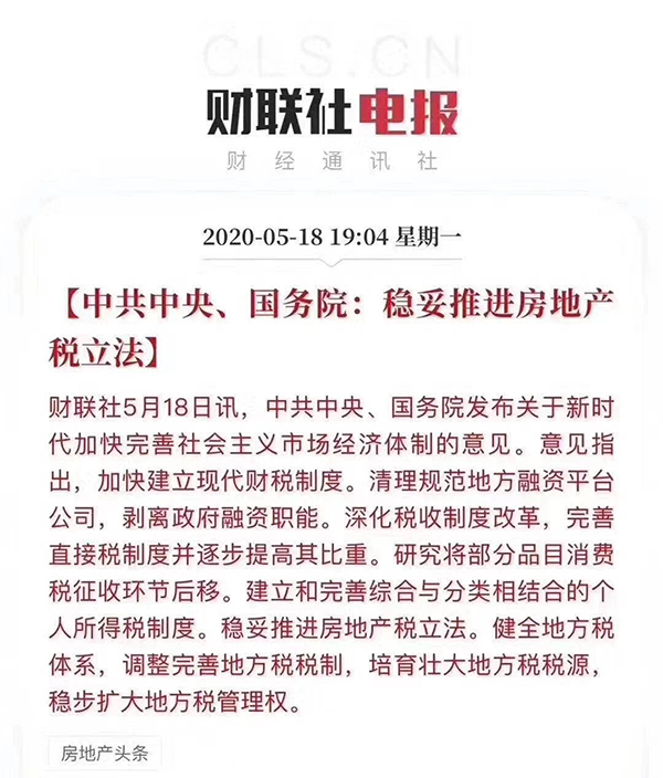 5月18日,中共中央、国务院发布的《意见》提及,加快建立现代财税制度,稳妥推进房地产税立法。
