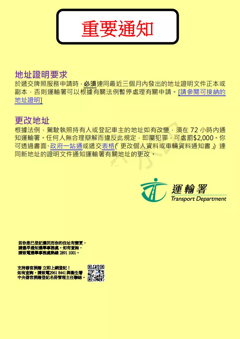 关于申请香港驾照需要提供的<住址证明>:香港运输署规定,中国驾照免试申请香港驾照,需要提供申请人有效的<住址证明>。住址证明包括两个,一个是香港的住址证明,另外一个是大陆的住址证明,申请人可提供本人的信用卡,借记卡,手机或者水电煤气等任意一份账单及信封,账单需包含显示申请人姓名和当前住址的信息,有效期为近三个月中任何一个月。