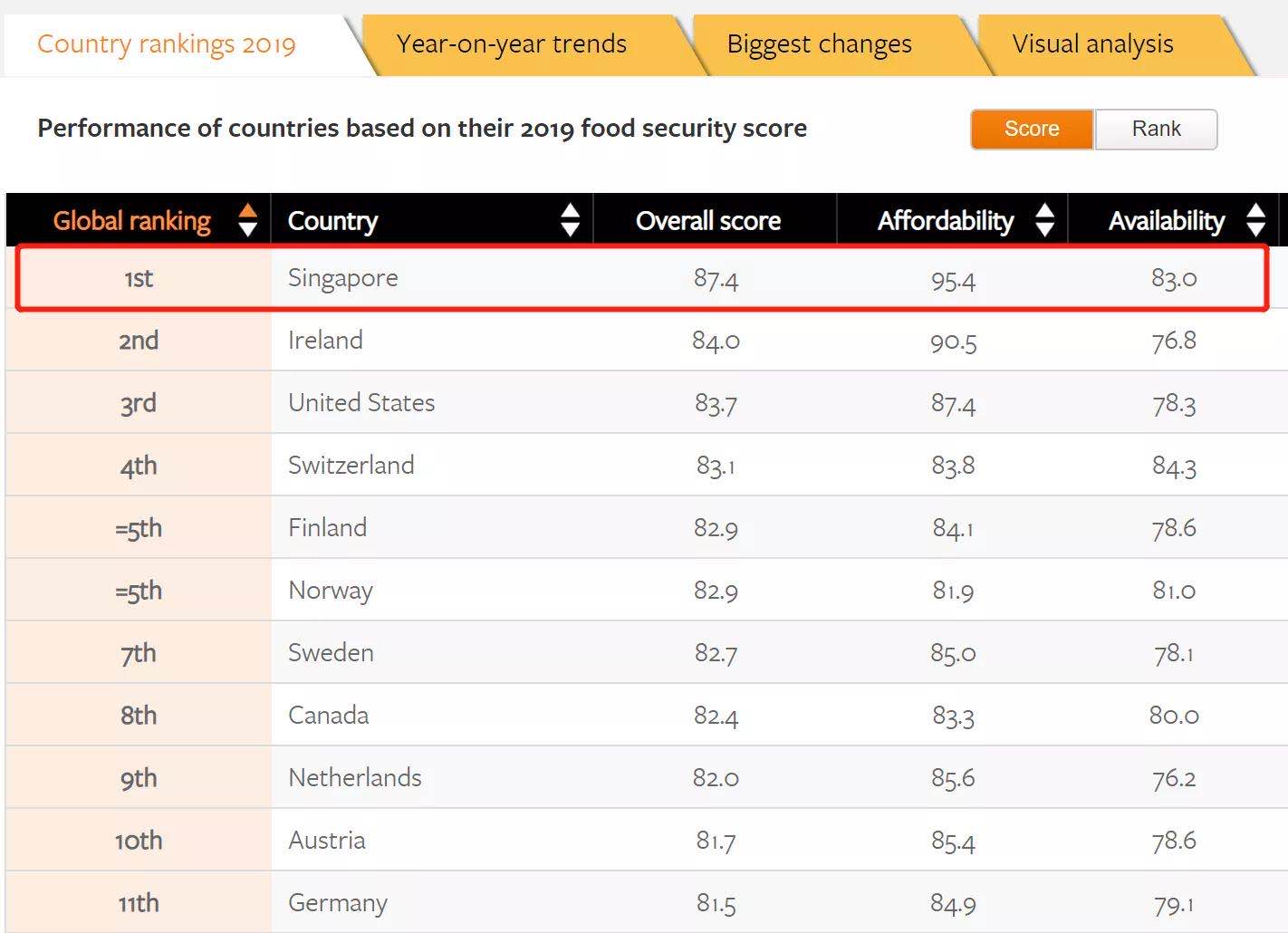 2019年《全球食品安全指数报告》中,新加坡继续蝉联第一。(2018年也是榜首)