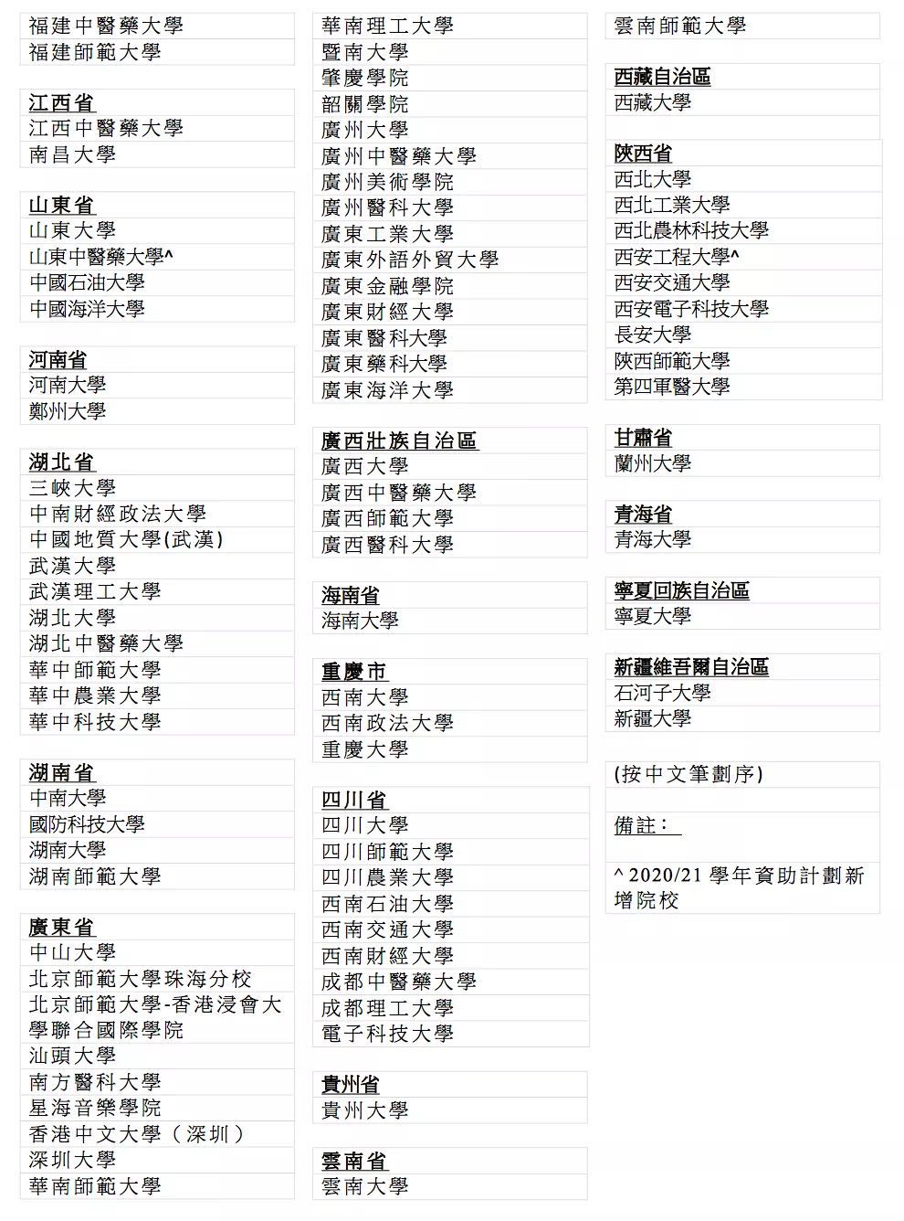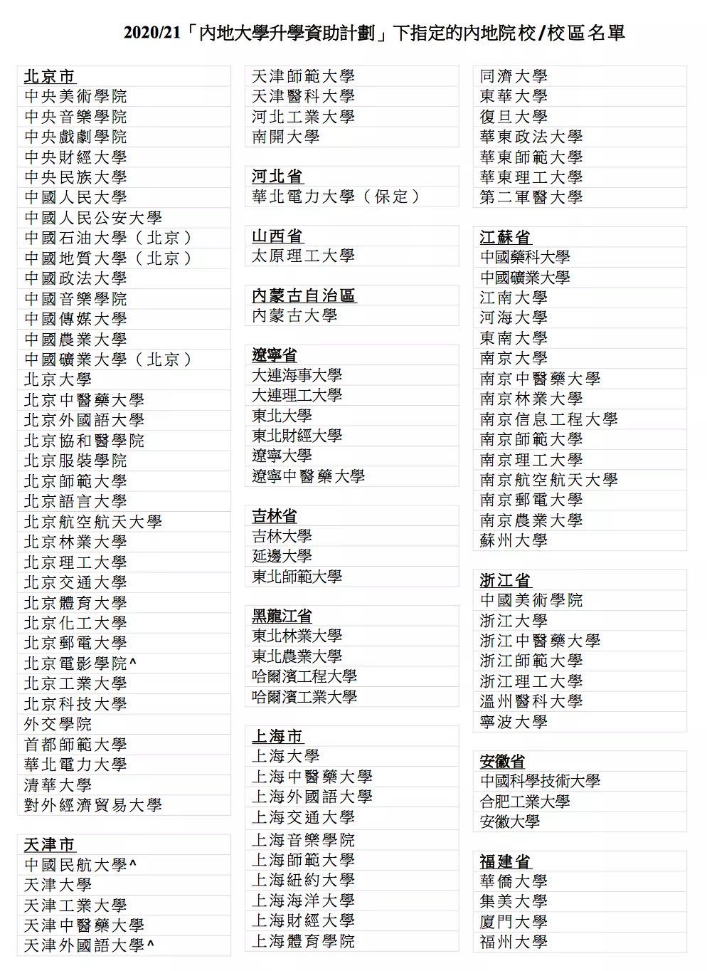 指定内地院校共有186所,包括将于2020/21学年参与「内地高校招收香港中学文凭考试学生计划」的122所院校。计划不设名额上限。