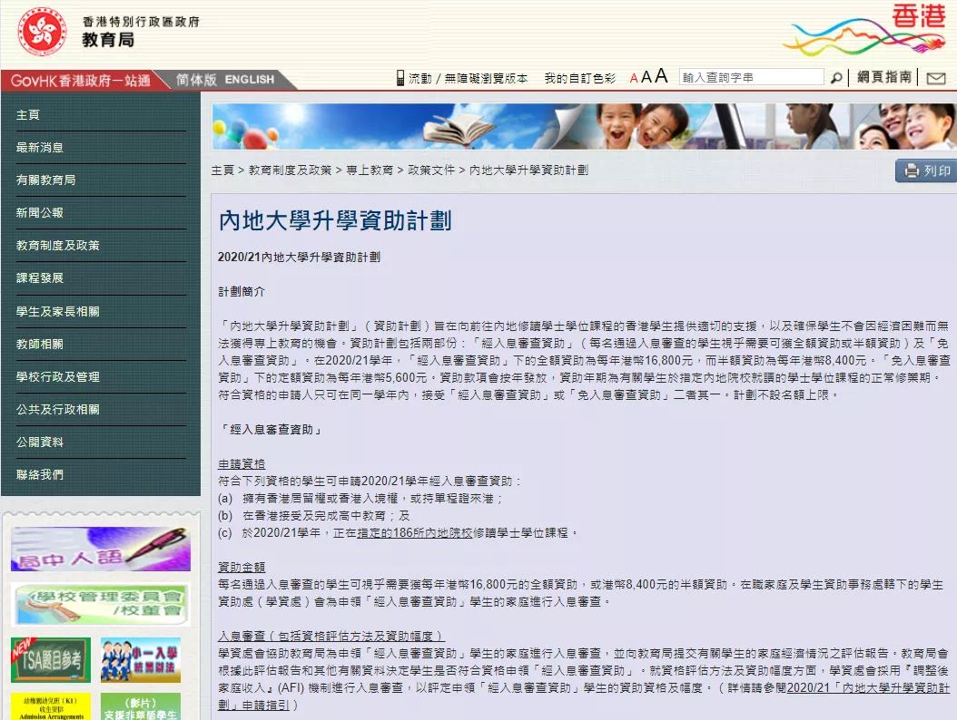 好消息!香港特区政府教育局6月1日宣布,2020至2021学年“内地大学升学资助计划”由即日起至9月21日接受合资格香港学生申请。