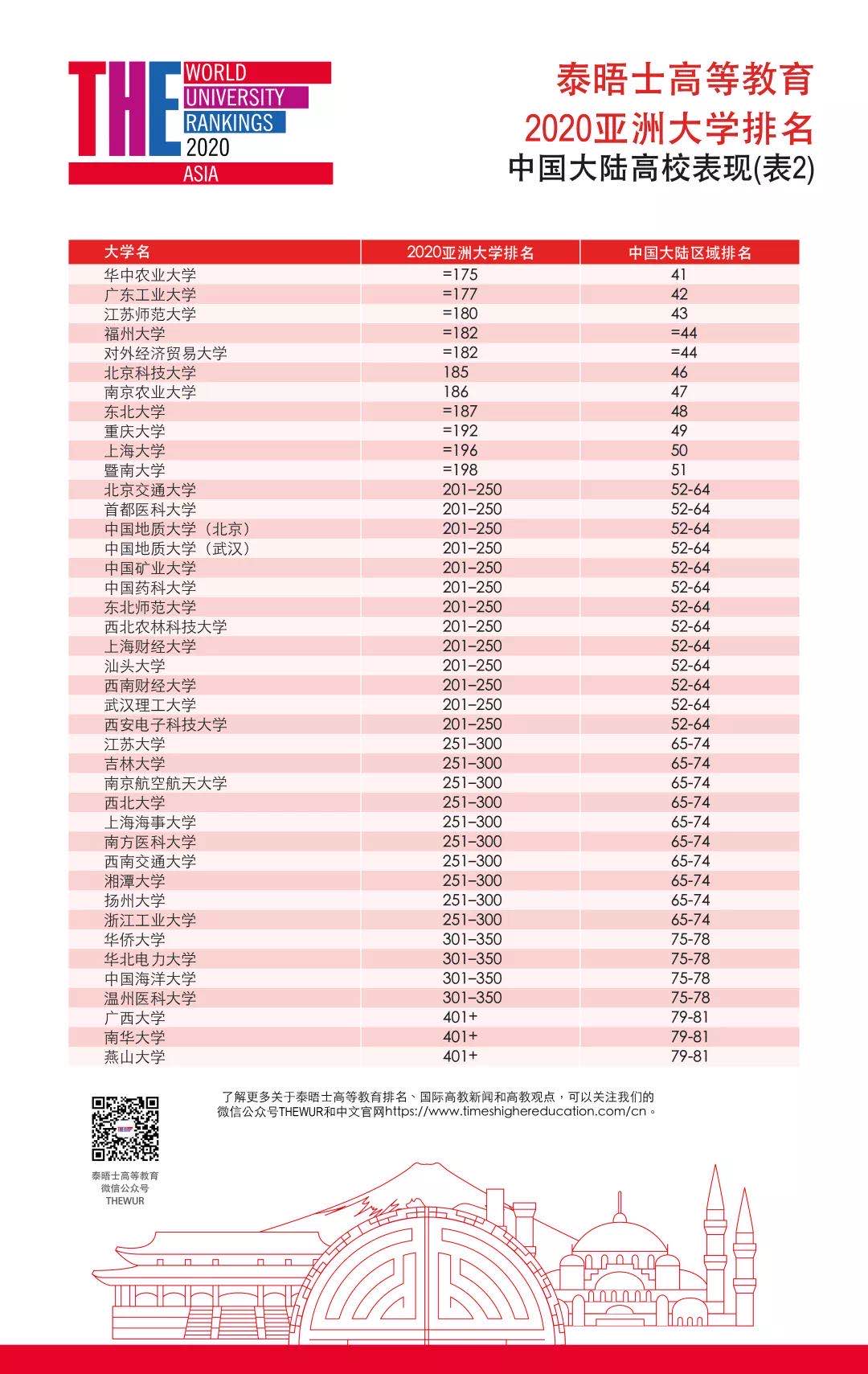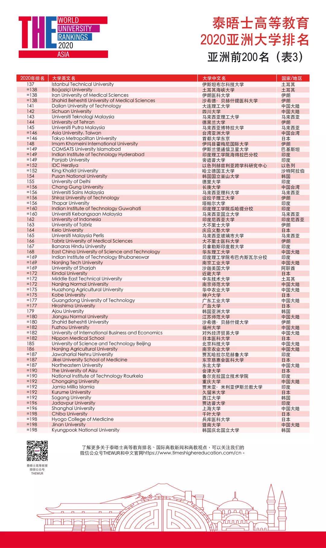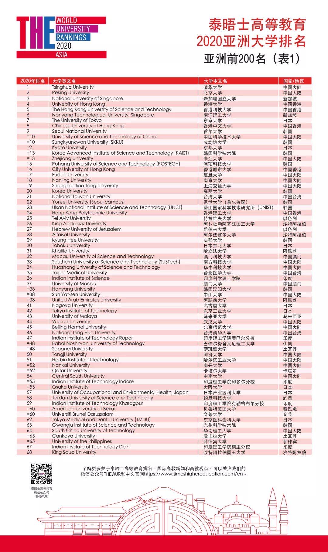 6月3日,泰晤士高等教育发布了2020亚洲大学排名。