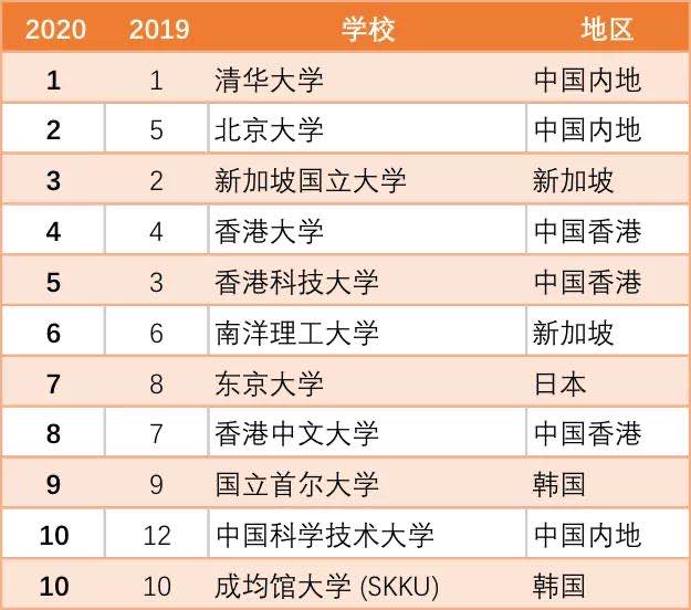 首10位继续来自内地、香港、新加坡、日本及南韩院校。中国香港地区高校表现依旧不错!