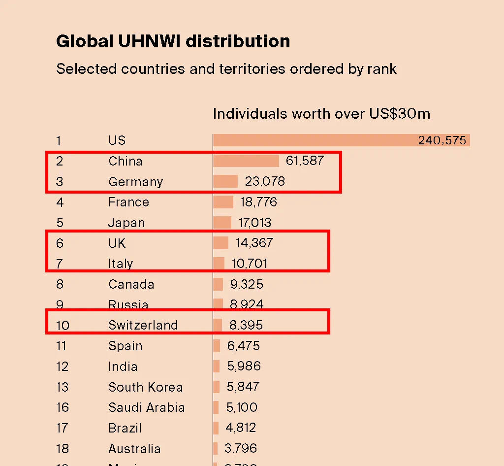 其中,欧美依旧占据绝对主力,美国有超过24万超高净值人群,居榜首。前十名中,欧洲国家占到5个,是超高净值人群国家最多的地区。