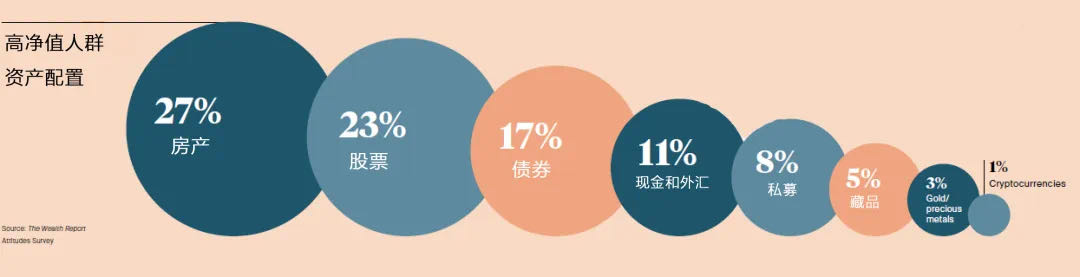 在高净值人群资产配置中,有27%选择了房产投资,其次是股票和债券。对于追求保值和长期增值方面,房产投资一直都受到高净值人群的青睐。