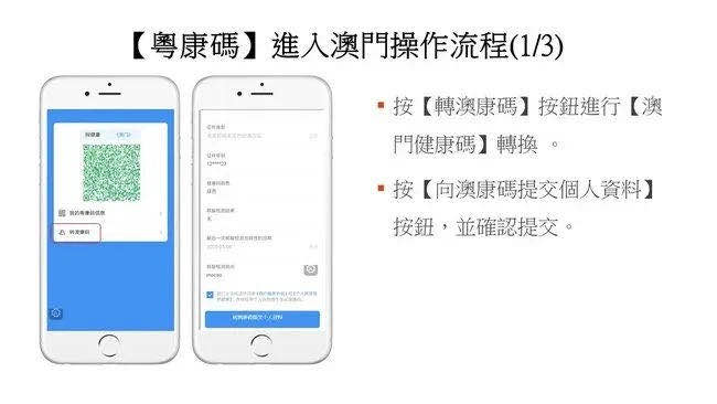 拿到“港康码”后,可在手机程序或政府官网上,经过简单的信息登记后,领取广东省的“粤康码”或澳门的“澳康码”(即转码)。凭借“粤康码”和“澳康码”可以免检疫进入广东或澳门。