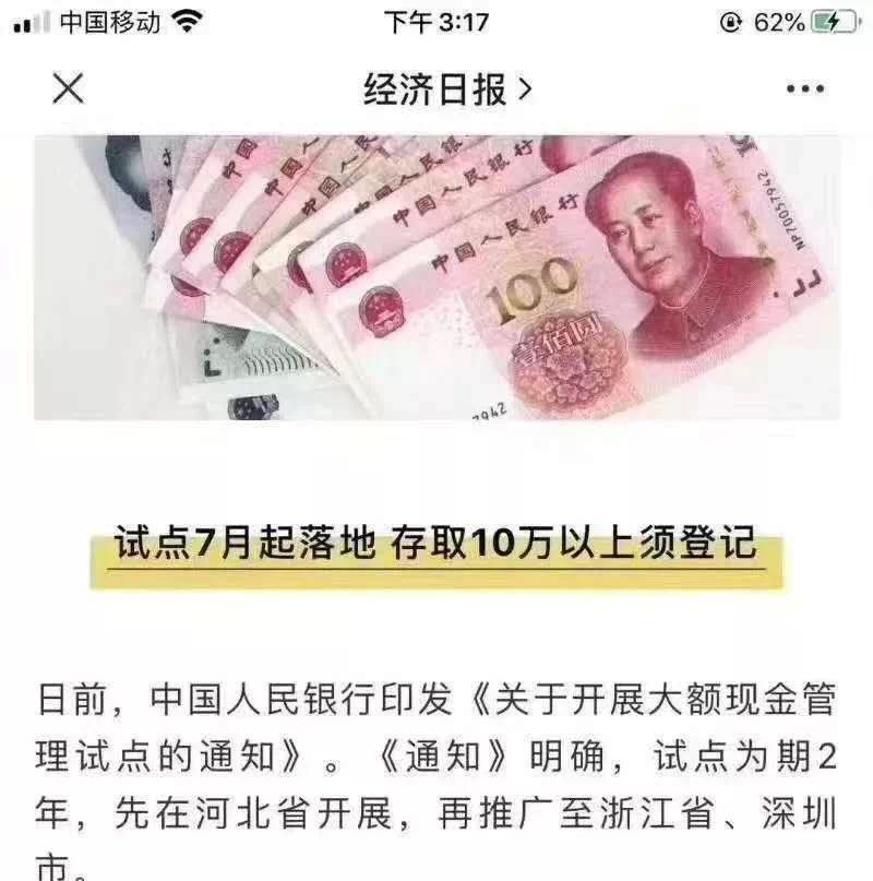 备受大家关注的大额现金管理,经过7个月意见征求后,央行近日发布了通知。7月起,大额现金管理试点将在河北省、浙江省、深圳市三地启动。