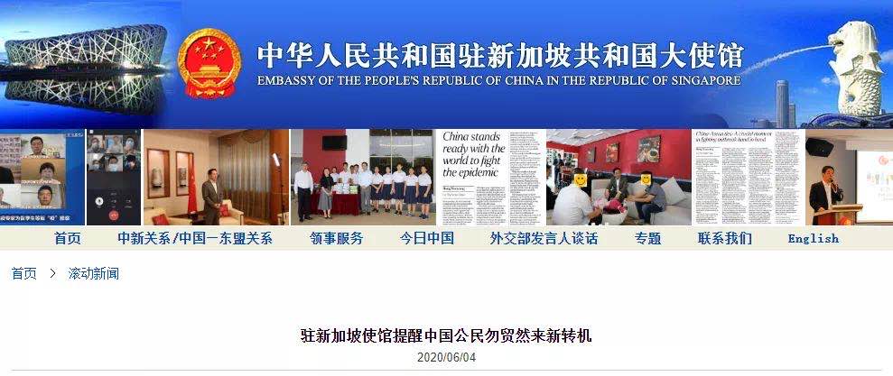 中国驻新加坡使馆为此提醒,如中国公民计划来新转机,务必事先与前段承运航空公司(即搭载旅客来新的航空公司)确定是否已获新民航局许可,并了解关于联程机票、行李直托等方面的要求,勿贸然购买机票或启程来新转机,以免被拒登机,造成经济损失或滞留。