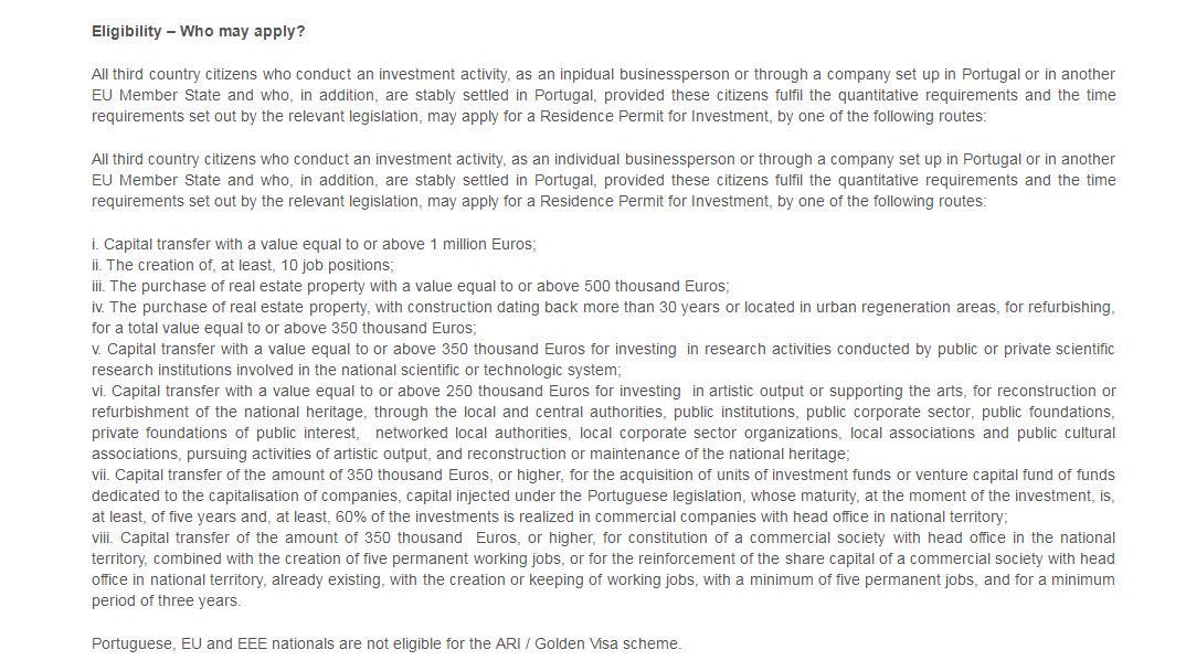 依据此法案申请黄金签证的非欧盟国家公民,应投资至少35万欧元购买公司资本化的投资基金或风险投资基金。其投资期限至少是五年,并至少有60%的投资通过总部设在葡萄牙境内的商业公司实现。