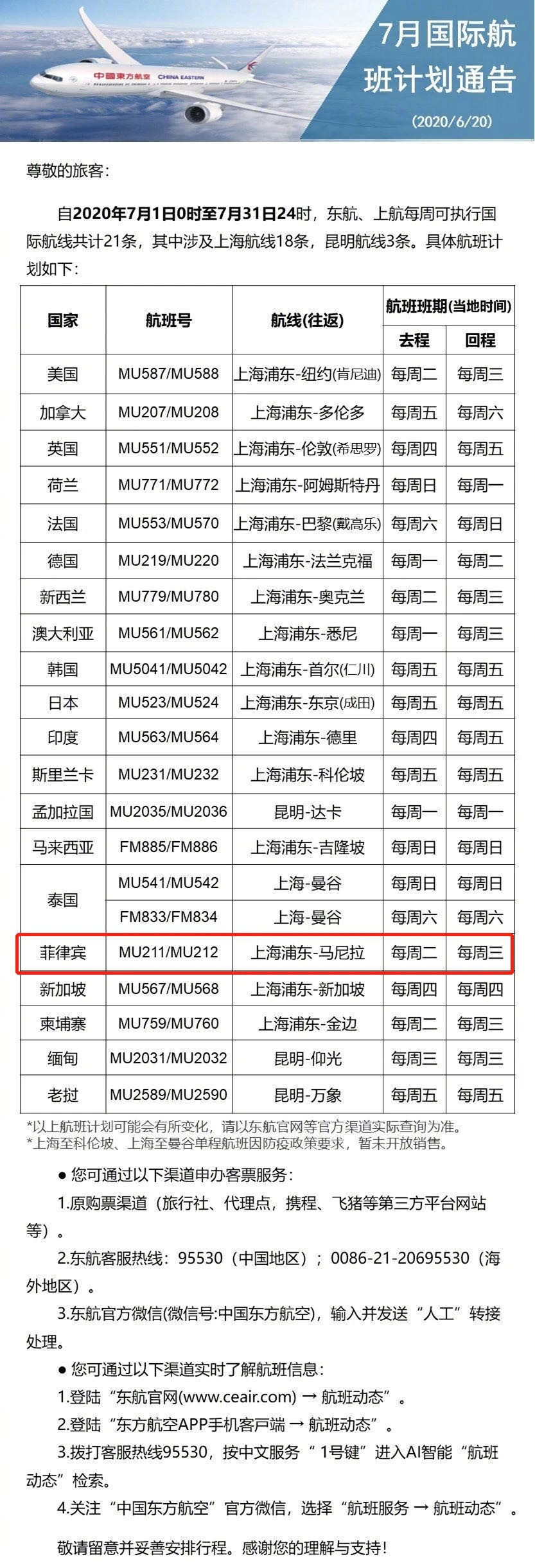 自2020年7月1日至7月31日,东航、上航每周可执行国际航线共计21条,其中涉及上海航线18条,昆明航线3条,南京航线3条。具体航班计划如下: