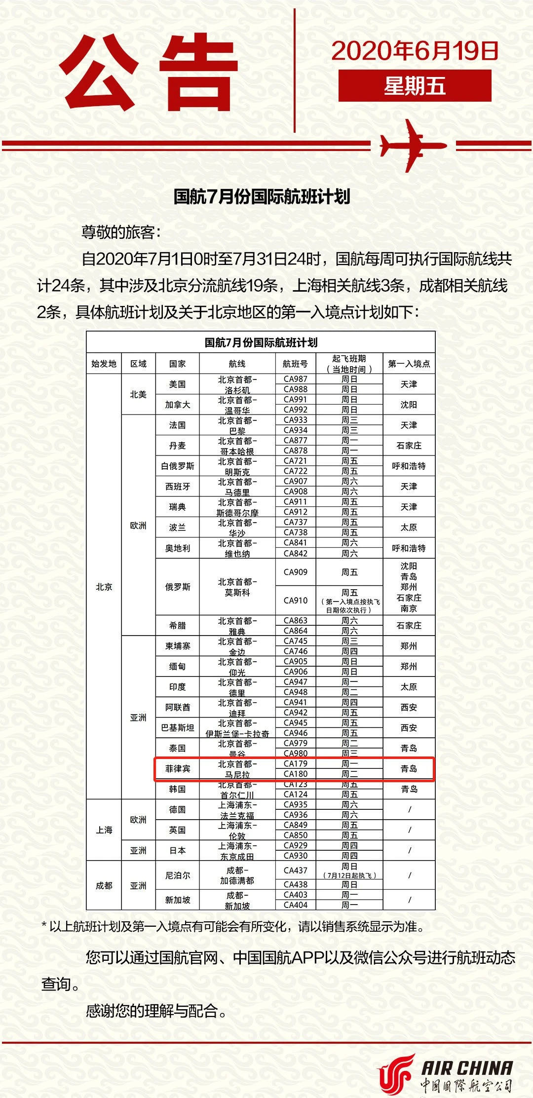 国航19日发布7月国际航班计划,每周可执行国际航线共计24条,其中涉及北京分流航线19条,上海相关航线3条,成都相关航线2条,具体航班计划及关于北京地区的第一入境点计划如下: