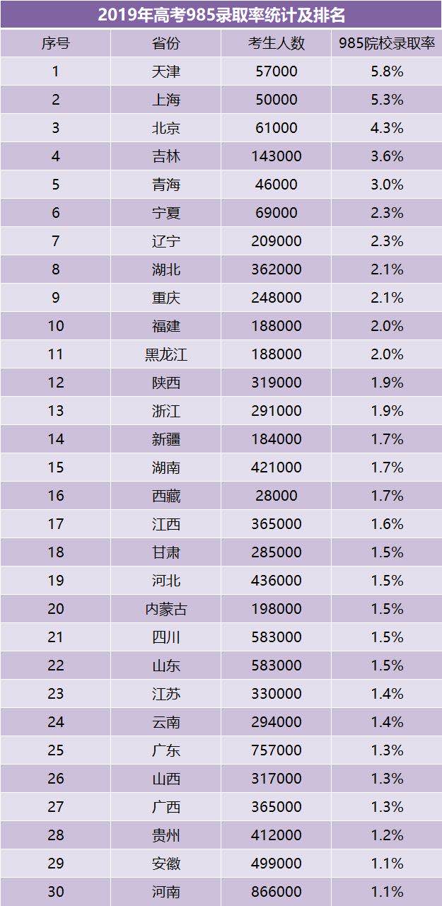 从去年的数据来看,各省市985大学的录取率,有近18个省录取率不到百分之二。录取率最高的直辖市为天津,也还不到百分之六,这其中还包括往年复读考上的孩子。也就是说应届生考上名校的概率即使在占尽优势的天津,也不足百分之六。