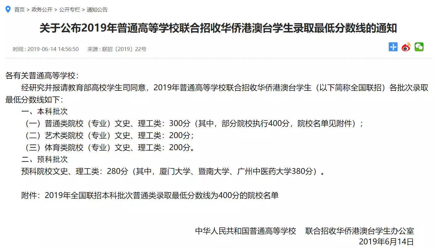 根据2019年华侨生录取分数线,2019年中国普通高等学校华侨港澳台联考招生最低控制分数线如下:
