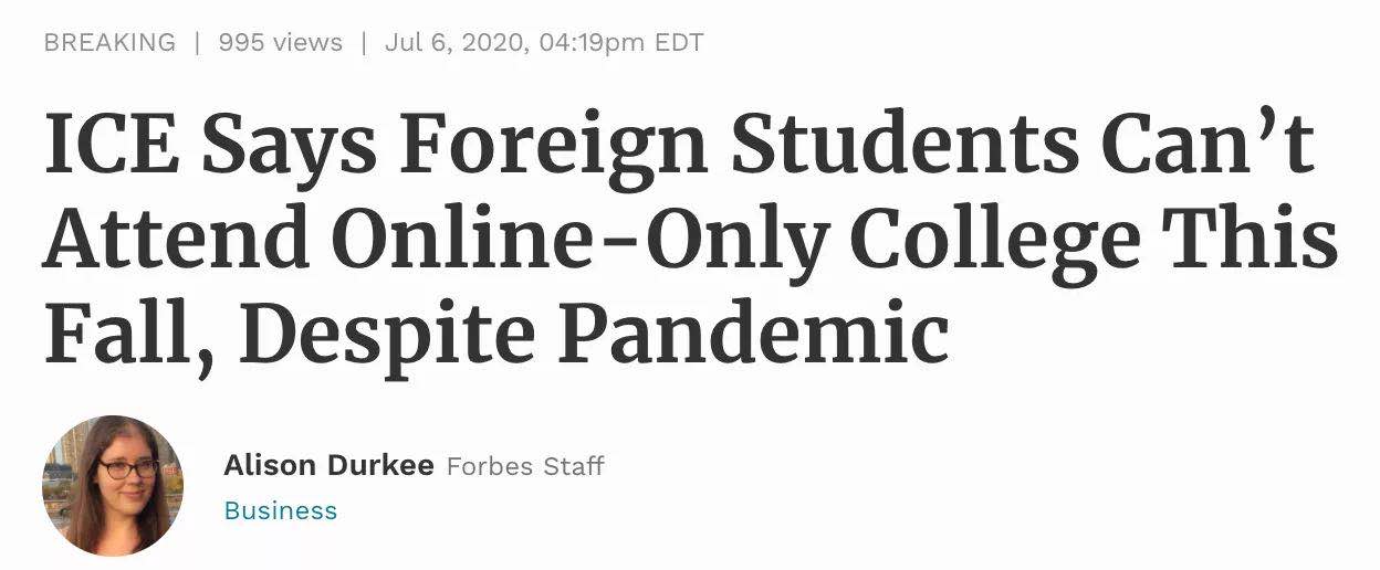 美国时间7月6日,美国移民局宣布国际留学生不能在美国上网课。
