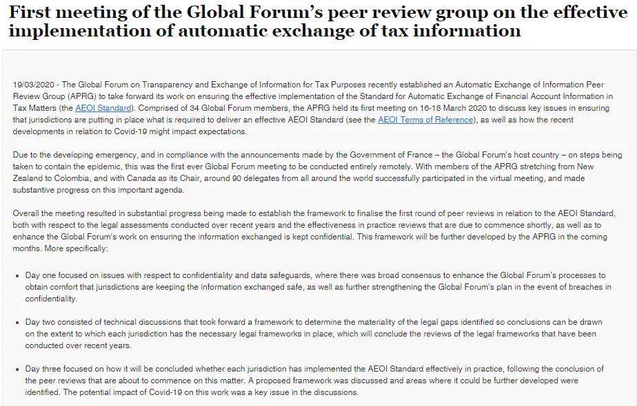 在2020年3月16日至3月18日,连续三天时间,OECD举行了金融账户涉税信息自动交换的同行评议小组(APRG)的第一次会议,着重讨论了如何接下来有效确保各国能够坚决落实AEOI全球金融账户涉税信息的关键问题和关键补漏。