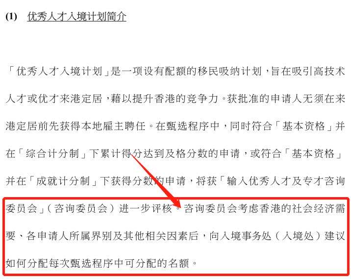 香港入境处在香港优才入境计划简介里明确表示,咨询委员会会考虑香港的社会经济需要、各申请人所属界别及其他相关因素后,向入境处建议如何分配每次甄选程序中可分配的名额。