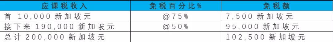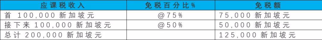 新成立的新加坡(税收)居民企业的应税收入中,前100,000新加坡元的部分可获得 75% 免税,100,001-200,000 新加坡元的部分可获得50%的税收减免,该计划的其他内容保持不变。