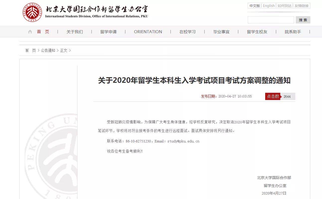 今年北京大学也宣布:取消2020年外籍学生入学考试,改为远程面试。