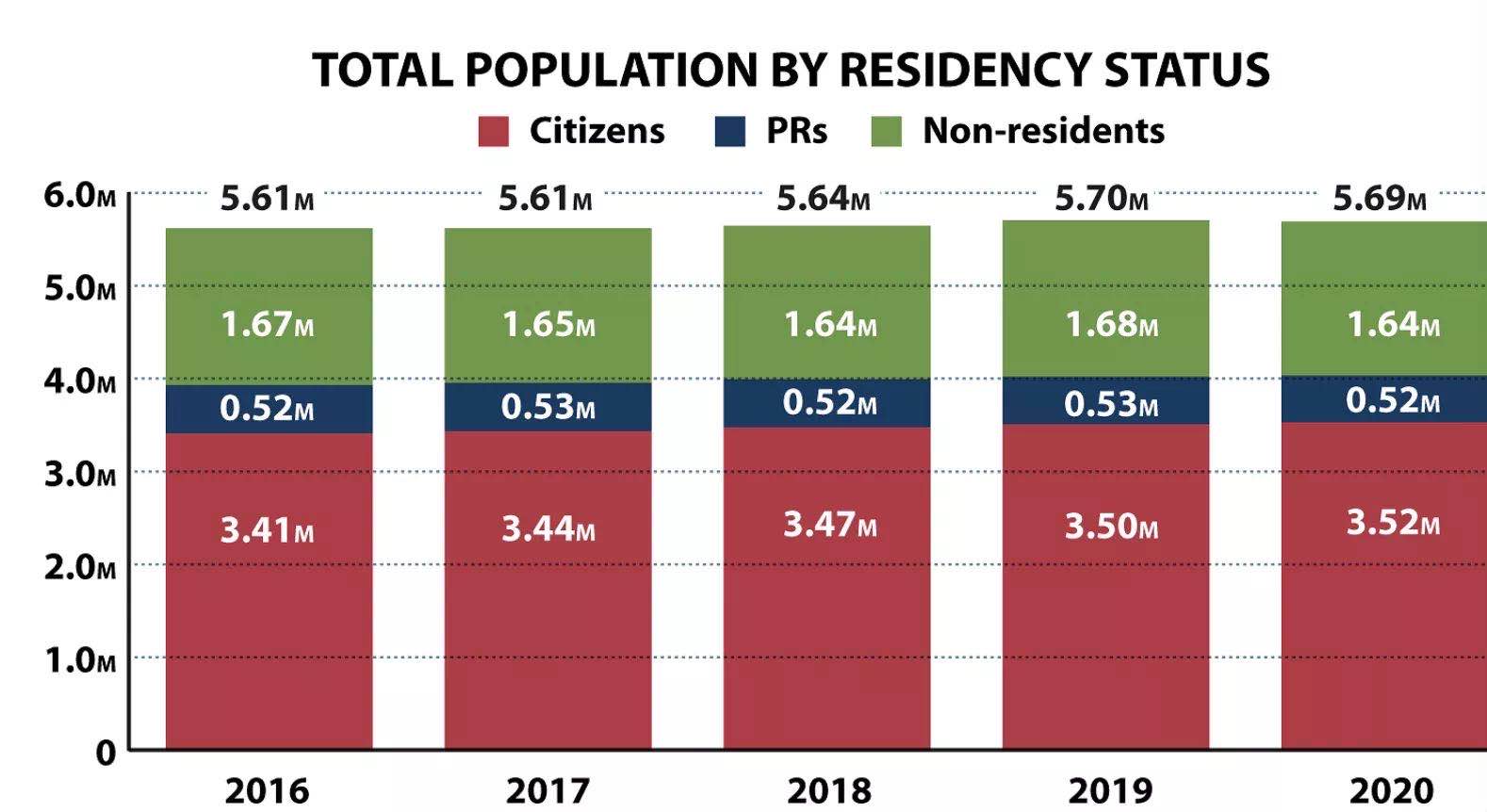 而另一方面,新加坡公民的数量增加约2万人,达到352万人!永久居民的人数跟去年差不多,52万,没有太大起伏。