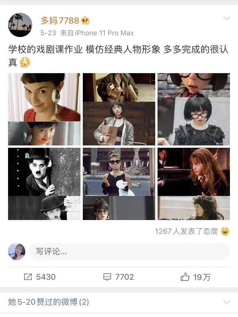 今年分享了一组黄多多在学校里的戏剧作业的照片也引发了热议。