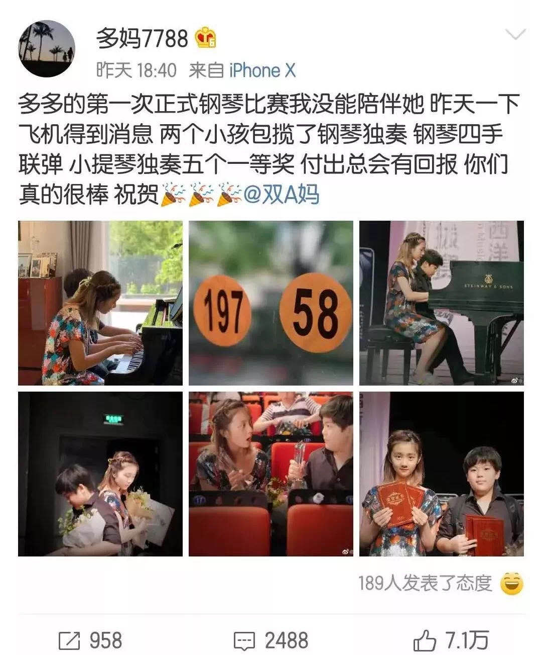 之前孙莉在微博晒出一组照片,透露黄多多和吕思清儿子在2019新加坡国际西洋乐大赛(中国选拔赛)中包揽了钢琴独奏、钢琴四手联弹、小提琴独奏,共5个一等奖。