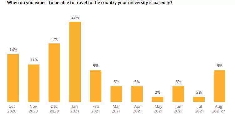 对于那些没返校的留学生,有14%希望2020年10月能顺利返校,17%的留学生期望在12月前,而23%的人是希望在2021年1月前返校,也就是赶春季学期。
