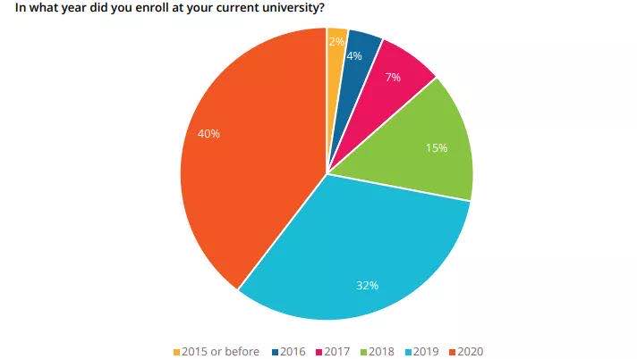 据调查,秋季学期开学后,有61%的留学生目前在学校所在地上课,33%的留学生是在家中远程学习,还有6%的学生回答在其他国家。