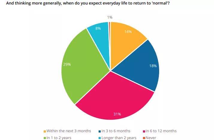 QS让返校留学生预测恢复正常生活的时间,14%的留学生认为未来3个月内,有望恢复正常;18%的人预计需要3-6个月;31%的留学生预计要6-12个月才能恢复正常。
