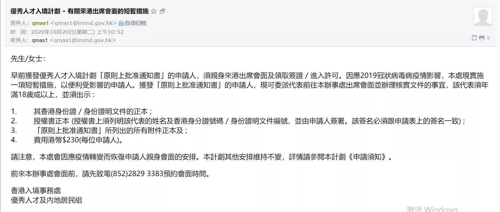 香港入境处表示,受新冠疫情的影响,早前众多获发优秀人才入境计划“原则批准通知书”的申请人,无法亲身到香港面试。为了不影响原则性获批的申请人,特推出一项短暂措施: