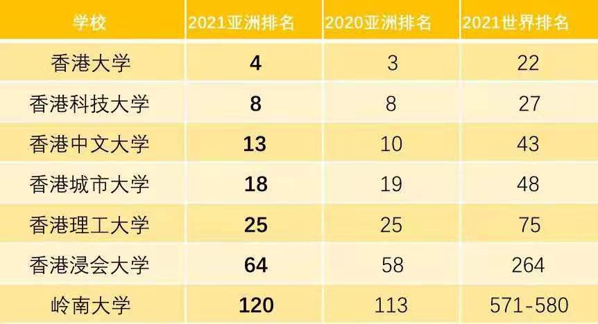 排名较去年上升的学校有,香港城市大学,岭南大学,香港树仁大学。