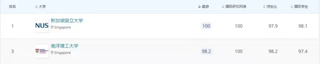 新加坡地区今年共有3所大学上榜,均进入亚洲Top100。